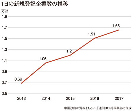 中国では、前述のようにモバイル決済やシェアリングエコノミーなどの新興産業の発展が著しい。それを支えているのは、中国の起業意識の高さだ。全人代で配布された資料によると、13年に約6900社だった中国国内の1日の新規登記企業数は、17年は約1万6600社に急増した。