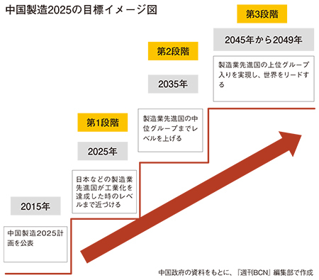 中国製造2025は、中国政府が15年に公表した計画で、今後、三段階の発展を想定している。第一段階は25年までの10年間で、日本などの製造業先進国が工業化を達成した時のレベルまで近づけることを目指している。第二段階は35年までの10年間で、製造業先進国の中位グループまでレベルを上げることを目標に設定した。第三段階は45年から建国100周年の49年までに、製造業先進国の上位グループ入りを実現し、世界をリードする国になることを想定している。
