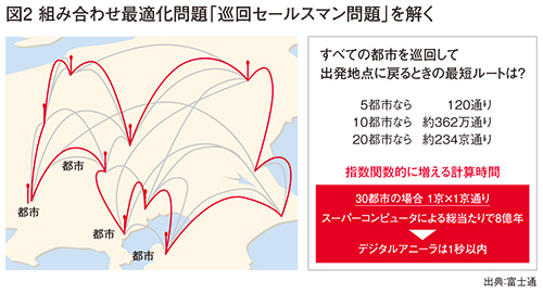 アニーリング方式が得意とする計算は、「組み合わせ最適化問題」で、その代表例として知られているのが「巡回セールスマン問題」。多くの都市を巡回するにあたって、最短ルートを求める計算である。例えば、5都市を巡回するルートは120通りのパターンがあり、そのパターンから最短距離を求める。それが、10都市となると約362万通り、20都市なら約234京通りというように、指数関数的に計算パターンが増えていく。30都市では、1京×1京通りのパターンを計算しなければならず、スーパーコンピュータ「京」で計算するには、実に8億年の計算時間が必要となる。これを瞬時に計算するのが、アニーリング方式の量子コンピュータである。デジタルアニーラでは、30都市を巡回する最短ルートを1秒以内に計算するという(図2)。