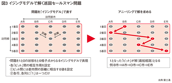 巡回セールスマン問題は、「イジングモデル」で表現することができる。イジングモデルとは、「0」と「1」の状態をもつものを格子状に並べたものをモデル化したもの。巡回セールスマン問題のイジングモデルでは、訪問する都市の相関関係を考慮しながら、組み合わせを計算して最短経路と思われる解を求める。つまり、アニーリング方式ではすべてのパターンを計算するのではなく、都市の相関関係を考慮しながら、もっともらしい答えを出す(図3)。その意味では最短経路とは限らないが、瞬時に計算が終了するため、何回も実行することで、確からしい答えを求めればよい。