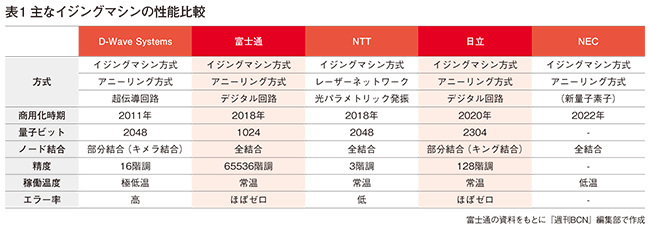 一方、NTTなどが取り組む「量子ニューラルネットワーク(QNN)」は、2048量子ビットで全結合、3階調の精度となっている。QNNは光ファイバーを通る光を利用するため、デジタルアニーラと同様、常温で利用できる。デジタルアニーラとQNNは、性能面と運用面で世界をリードしているのである。また、国産勢では、日立とNECもアニーリングマシンの開発に取り組んでいる。NECが取り組むアニーリングマシンは、量子コンピュータでありながら、全結合を実現すると発表している(表1)。