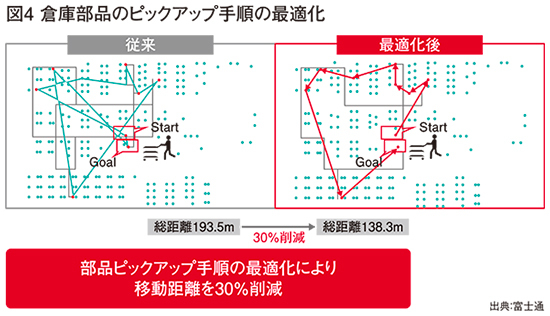 富士通は、自社工場内にデジタルアニーラを導入し、倉庫部品のピックアップ手順の最適化に取り組んだ(図4)。倉庫に複数の部品を取りに行くにあたっては、経路次第で距離が大きく変わってくる。