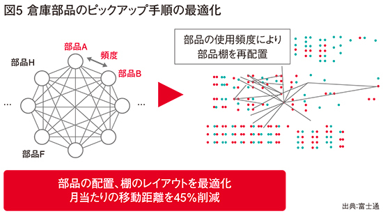 さらに富士通は、同工場で部品の配置と棚のレイアウトもデジタルアニーラで計算し、最適化(図5)。これにより、倉庫部品のピックアップにおける月間の移動距離が、約45%削減できたという。
