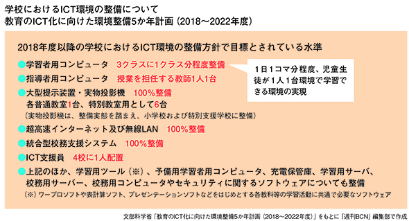 そこで、17年度を終え、新学習指導要領の実施も見据えた新たな方針として、文部科学省は「2018年度以降の学校におけるICT環境の整備方針」を取りまとめるとともに、この整備方針を踏まえた「教育のICT化に向けた環境整備5か年計画(18~22年度)」を策定した。新たな整備方針では、児童・生徒が使う学習者用コンピュータの配備を3クラスに1クラス分程度とし、授業で必要な時に一人1台の環境を用意できるようにする。加えて、故障時などの予備用として複数の端末を備えることを定めた。また、授業を担任する教員一人1台分の指導者用コンピュータの配備、普通教室に加えて、特別教室での大型装置や実物投影装置、無線LANの整備、学校ごとに1台の学習用サーバー、教育委員会ごとに1台の校務用サーバーの整備など、新たな追加事項を含めて、IT環境がより充実化されていく方針となっている。18年度から22年度にかけて、単年度1805億円の地方財政措置もとらている。