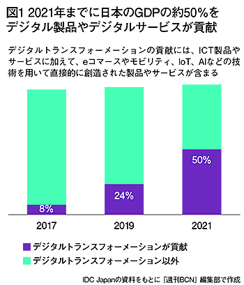 IDC Japanは、「21年までには、世界のGDPの50%以上がデジタル化され、デジタルITによって強化された製品/サービス、運用、顧客との関係がますます重要になる。こうした変化が、すべての産業で起こる」と指摘(図1)。これからの時代において、DXは企業の生き残りを左右する取り組みであるといえる。