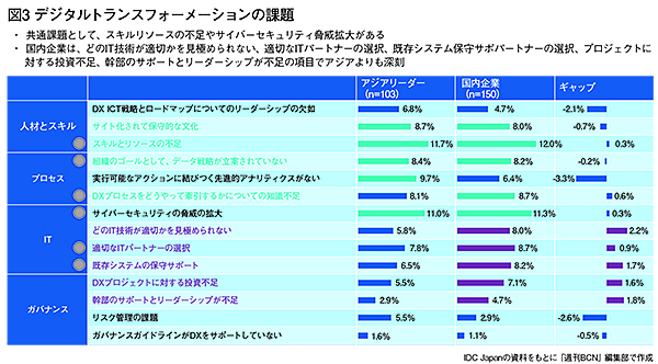 同調査では、日本の企業は「どのIT技術が適切かを見極められない」「適切なITパートナーが選択できない」「既存システムの保守サポートに追われている」「プロジェクトに対する投資不足」「幹部のサポートやリーダーシップが不足している」といった点で課題を抱えているとしている(図3)。これらの課題は、DXに踏み出したくても踏み出せないという状況を示すものだといえよう。