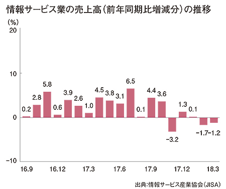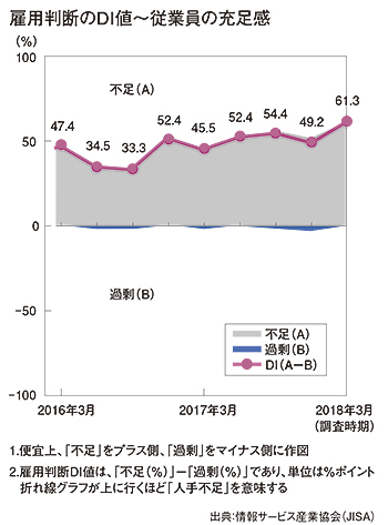 底堅いIT投資に支えられて、主要SIerの業績は堅調に推移している。経済産業省「特定サービス産業動態統計」をもとに情報サービス産業協会(JISA)がまとめた情報サービス産業の売上高推移をみると、直近ではマイナス成長となっている。ところが、同じくJISAがまとめている直近の雇用判断DI値調査では、従業員の不足感がここ数年で最高となる61.3%ポイントに達した。仕事はあるが、人材を確保しにくい状況が続いており、情報サービス業の売上高に影響していることが窺える(図参照)。