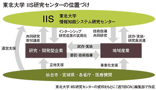 仙台市は、東北大学のテクノロジーと地元企業を結びつけ、地域課題解決を促進させるため、10年2月に東北大学内にIIS研究センターを開設した。仙台市が運営費用を負担し、企業出身の特任教授やスタッフを雇用する。仙台市経済局 産業政策部産業振興課の白岩靖史課長は「東北大学の最新のテクノロジーと地域産業を橋渡しする機関」と説明する。