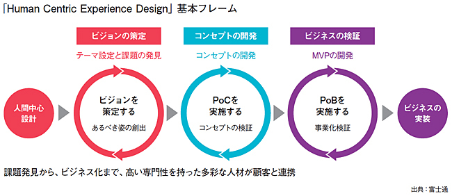 顧客企業の多くは、AIやIoTのビジョンを明確に持っていない。そのため、ビジョンをつくるところから一緒に活動する。富士通では未来の顧客体験のユースケースをすでに30ほど用意しており、さらに「Human Centric Experience Design」としてデザイン思考の方法論を確立、これを基本フレームワークとして「Experience Design Service」を有償で提供している。ここでは「デザイナー、SE、コンサルタントが一緒になり、未来のビジョンの策定からそこに至る具体的なソリューションの構築までをサポートする」と富士通の梨美由希・マーケティング戦略本部 ブランド・デザイン戦略統括部長シニアディレクターは指摘する。