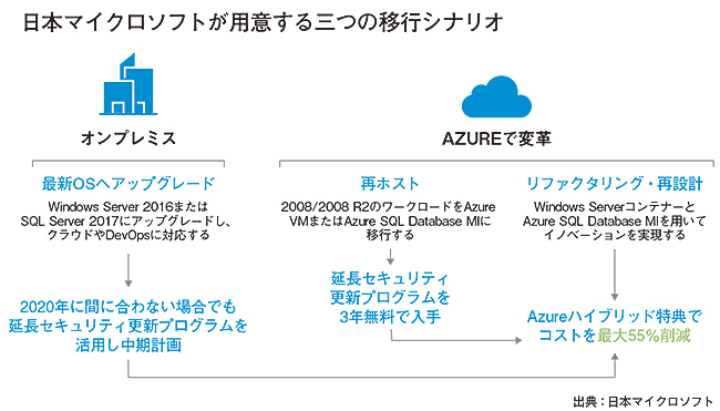 日本マイクロソフトはWindows Server 2008環境を最新インフラに移行するための具体的な方法として、三つのシナリオを用意している。一つはオンプレミス環境をそのまま最新のWindows Serverにアップグレードする方法、二つめはオンプレミスのWindows Server 2008環境をAzureにリフト&シフトした後に最新インフラに移行する方法、そして三つめが、AzureのPaaSを活用して一気に業務アプリケーションのリファクタリング(再設計)をしてしまうという方法だ。同社は前者二つのシナリオを選んだユーザー向けに、Windows Server 2008環境をサポート終了までに最新環境に移行できなかった場合でも、延長セキュリティー更新プログラムを提供する。このプログラムはWindows Server 2008のサポート終了から3年間にわたって提供される。ただし、Azureへのリフト&シフトを選択すれば無料で使うことができるが、オンプレミスで利用する場合は有償だ。