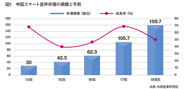 中商産業研究院の調査によると、中国のスマート音声市場は年々拡大しており、17年は前年比70%増の105億7000万元になった。18年は159億7000万元になる見通し。グローバルでも同様の傾向になると予想されている。