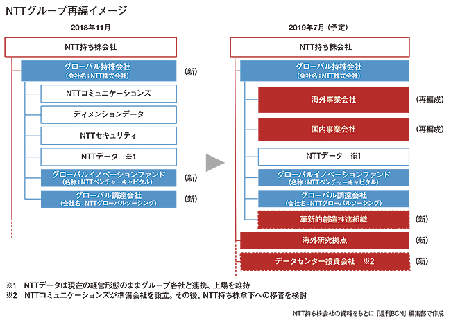NTTグループは、海外事業の再編を急ピッチで進めている。この11月、NTT持ち株会社の下に、海外事業を取りまとめる中間持ち株会社を新設。この下にNTTデータ、NTTコミュニケーションズ、ディメンションデータなどを置いた。さらに19年7月には、NTTコムとディメンションを統合するかたちで、グローバル中間持ち株会社の下に海外事業会社と国内事業会社を配置。NTTデータは今の経営形態と株式上場を維持したまま、新しくできる海外会社、国内会社と横並びとなる見込み。