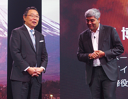 RPAツール「Automation Anywhere」を提供する米オートメーション・エニウェアでは、空席となっていた代表取締役社長に日本オラクル前社長の杉原博茂氏が就任。この写真は、その発表での一コマ。米オートメーション・エニウェアのミヒール・シュクラCEOのしぐさが、まさに三顧の礼である(