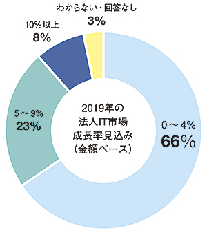 日本経済の好景気が続く中、近年好調に推移しているIT市場の動向についても、回答が得られた全てのベンダーが、19年もプラス成長が続くとみているようだ。内訳は、「0~4%」が66%、「5~9%」が23%、「10%以上」が8%、「わからない・回答なし」が3%だった。