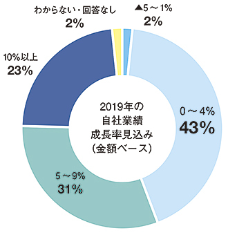 市場全体の伸びを多くの企業が予想するだけあって、自社業績の成長率についてもプラス成長とみる企業がほとんどだ。「0~4%」が43%で、市場の伸びと同程度の堅実な数字を予想する企業が最も多く、次いで「5~9%」の成長を見込む企業が31%だった。