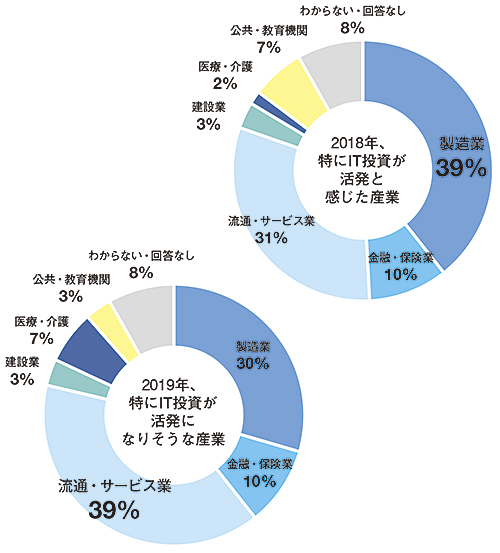流通・サービス業は、「19年に投資が活発になりそうな産業」で39%と最も多かった。訪日外国人客のインバウンド需要への対応やオムニチャネル化、キャッシュレス決済の動きがユーザー企業のIT投資を後押ししている。特に東京五輪が開催される20年には訪日外国人客数の大幅増が予想され、それに向けたネットワークや決済関連の設備投資が活発化してきていると推測される。