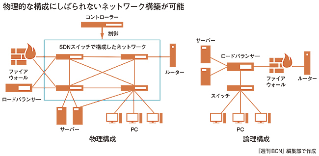 これに対して、SDN対応のスイッチを利用して構築した企業ネットワークが、上図の左側に描かれた構成である。企業の拠点内に複数のSDN対応スイッチが配置されており、各機器はそれらのうちどのスイッチに接続されていてもよい。ファイアウォール、ロードバランサーといったネットワーク機器や、サーバー、業務端末のPCなどが、物理的にはバラバラに接続されているが、SDNの場合、これらがどのような経路で通信するかは、管理ソフトウェアに相当する「コントローラー」によって制御されており、実際にはこのネットワークは、上図の右側の論理構成のように動作している。