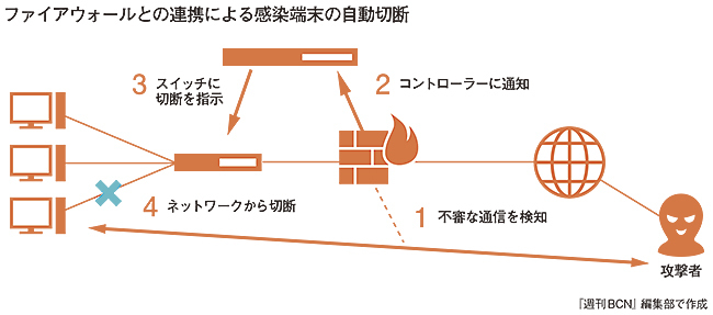 また、サイバー攻撃に対する対応能力を高められるのもSDN導入の大きな効果だ。NECでは、ファイア・アイ、パロアルトネットワークス、トレンドマイクロなどが提供するセキュリティー機器と連携し、攻撃を検知すると自動的に感染端末をネットワークから切り離す仕組みを提供している。従来であれば、アラートが上がったIPアドレスに対応する端末を調べ、IT担当者が感染端末の場所まで行ってケーブルを引き抜くといった作業が必要だったため、切り離しには数分から数日が必要だったが、これらの対応をSDNで自動化すれば、数秒から数十秒で済む。二次的な感染の拡大を防ぐ仕組みとして有効だ。