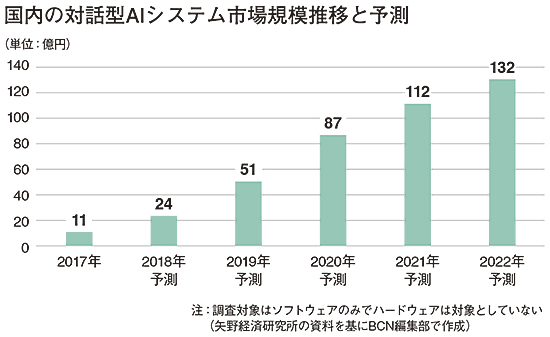 なかなか普及が進んでこなかったチャットボットが拡大の兆候を見せ始めたのは16年。矢野経済研究所の推計によると、17年の国内における対話型AIシステム市場の規模は約11億円で、それが22年には約132億円まで膨れ上がると予測する。特に、UIとなるメッセージツールのオープン化が進むことにより、チャットボットのベンダーが増えているという。主な利用用途には、社内の問い合わせ対応の省力化というB2B向けと、エンドユーザーへの接客としての新たなチャネルというB2C向けの2種類が考えられる。