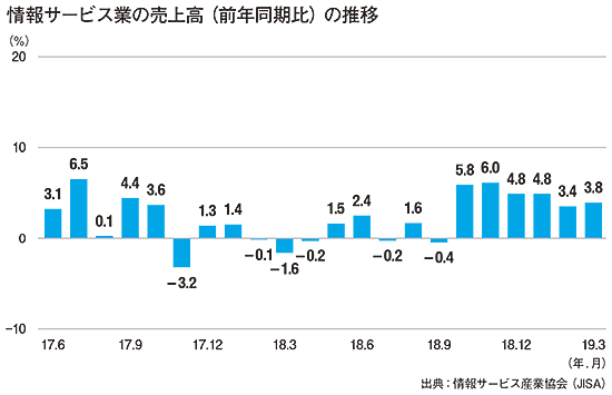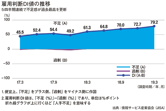 経済産業省の特定サービス産業動態統計調査をもとに情報サービス産業協会(JISA)が独自に作成した売上高推移によれば、昨年度下期(2018年10月~19年3月)の伸び率は前年同期比4%前後のプラスで推移した。これに伴って、JISAの雇用判断DI値調査では、従業員の不足感は昨年度(19年3月期)まで5四半期連続で過去最高を更新。SIerの業容拡大によって人員の不足感も一段と強まっている(図参照)。