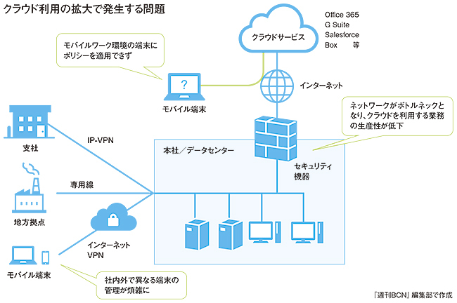 ITの利用形態がこのように複雑化する間、企業は本社や自社データセンターにトラフィックを集約することで、セキュリティポリシーの統一を図ろうとしてきた(図参照)。インターネットへの通信経路を全社で一本化し、出入り口部分となる自社データセンターにファイアフォールや侵入検知機器といったセキュリティ製品を設置。各地の支社や、工場・店舗といったリモート拠点は、専用線やIP-VPNなどの閉域ネットワークを通じてデータセンターと結ばれており、インターネット上のクラウドサービスへアクセスする際もいったんデータセンターのセキュリティ機器を経由するかたちになっている。モバイル端末を業務に利用する場合は、通信キャリアの閉域接続サービスやVPNを介して社内に接続する。この構成であれば、1カ所のデータセンターを監視するだけで、全社のトラフィックを掌握することができ、どのウェブサイトとの通信を許可するかといったポリシーも統一できる。