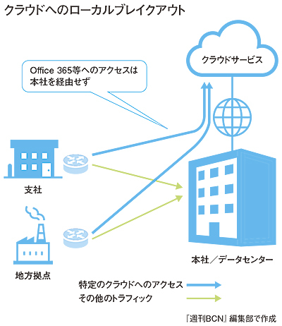 企業の拠点からクラウドサービスへアクセスする場合、閉域ネットワークを通じて本社を経由するのはコスト面でもパフォーマンスの観点でも非効率だ。そこで、Office 365やG Suiteなど、業務に使用する信頼されたサービスに関しては、安価なインターネット回線を利用して拠点から直接アクセスする。これがローカルブレイクアウトだ。一般のウェブ閲覧などは従来通り自社データセンターのセキュリティ機器を経由するので、URLフィルタリングなどのポリシーは引き続き適用することができる。
