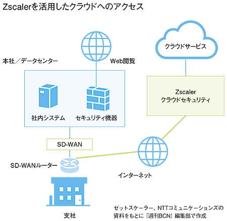 同社は昨年、NTTコミュニケーションズ(NTTコム)と戦略的なパートナーシップを結び、Zscalerクラウドのセキュリティ機能を、NTTコムのネットワークや各種ソリューションとセットで提供できる体制を整えている。NTTコムは、ローカルブレイクアウトのトラフィックでセキュリティを担保するためのツールとしてZscalerを活用する(図参照)ほか、SaaSアプリケーション/ウェブ閲覧を問わず全てのインターネットアクセスをZscalerに流し、Zscalerクラウドでセキュリティポリシーを統一する企業も今後増えるとみているという。