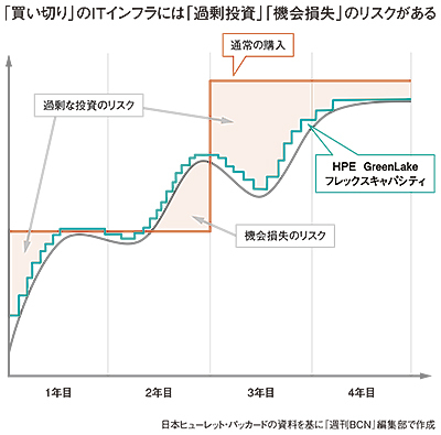 従量課金型ITインフラの最も分かりやすいメリットは、投資リスクの最小化だ。HPEでは、従来のIT投資が抱えるリスクを左のような図で説明している。オレンジ色の線は、サーバーやストレージなどの機器を購入して新規サービスを立ち上げた後、ユーザー数が増加したことから、3年目を迎えるタイミングでさらに機器を追加購入するというケースを示している。しかし、例えばユーザーの要求を満たすために必要だったITリソースの量が黒線のように推移した場合、サービス開始時点や、追加購入直後は過剰な資産を抱えていることになる。逆に、2年目の後半は、サービスの急成長に従って多くのリソースが要求されているにもかかわらず、企業が所有するIT機器ではそれをまかなえていない。サービス品質の劣化やサービスの中断が発生し、ビジネスの機会を逸している状態だ。