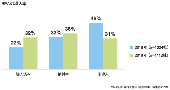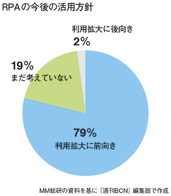 MM総研の調査によると、2019年1月時点で年商50億円以上の企業1112社のうち、RPAを導入済みの企業は32%。18年6月時点と比べて約10ポイント近く増加しており、大企業を中心としてRPAの利用が拡大傾向にあるとみられる。また、注目すべきは、導入済み企業の中で利用拡大に前向きな方針を持つ企業が79%に上ることだ。導入済みの多くの企業がRPAの効果に高い満足度を示しており、スケールアップに高い関心を持っていることが分かる。