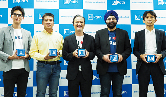 UiPathの長谷川康一代表取締役CEO(写真中央)とパートナー関係者