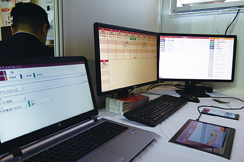 このシステムでは、どの部屋で何時からどんな料理をどんな順番で提供しなければならないかというスケジュールを、厨房やフロントで大型のモニターを通して共有できる仕組みになっている。一方、館内を動きまわる仲居も各自がスマートフォンを持ち歩き、同様の情報を共有する。厨房では、料理が完成するとタブレットからその情報をシステムに登録。それを見て仲居が各部屋まで配膳し、配膳が完了したらスマートフォンからその情報も登録する。なお、厨房では衛生面からキーボード入力もタッチパネルによる入力も適さないため、例えば手を握って上下に動かすと画面がスクロールする、人差し指を立てて腕を振るとチェックボックスにチェックが入るといったように、特定のモーションをカメラで認識して画面操作ができる仕組みを採用した。