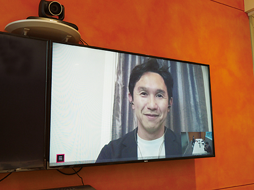 自社の遠隔会議システムで質問に答えるブイキューブ 間下直晃社長