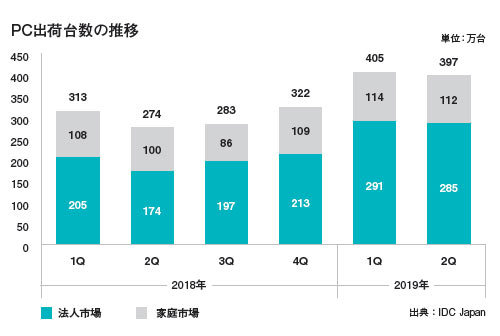 直近の国内PC市場は法人需要がけん引する形で成長している。IDC Japanの調査によると、18年の国内出荷台数は1191万台で、うち789万台が法人向けだという。法人市場だけで見れば前年比17.5%増という結果だった。インテルCPUチップの供給不足という懸念材料があったにもかかわらず、それを上回る勢いで成長した。19年はさらに勢いが増した。IDC Japanが今年8月に発表した調査結果では、デスクトップPC、ノートブックPC、ワークステーションを含むトラディショナルPCの第2四半期出荷台数は397万台を記録。そのうち285万台を法人向けが占めており、前年同期比で63.5%増という数値をたたき出している。