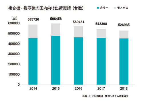 複合機の市場縮小が止まらない。事務機メーカーで構成される業界団体のビジネス機械・情報システム産業協会(JBMIA)が集計する出荷実績によると、国内向けの台数は、2009年のリーマンショックによる激減で年間50万台を下回った後、15年までは回復傾向にあった。しかし、リーマン前の水準を超えることはなく、16年からは再び減少に。以降、前年比3~4%程度の台数減が継続しており、この勢いで進むと、20年にはリーマン後の最低水準を更新する可能性がある。(取材・文/日高 彰)鮮明になる市場のシュリンク傾向