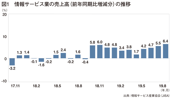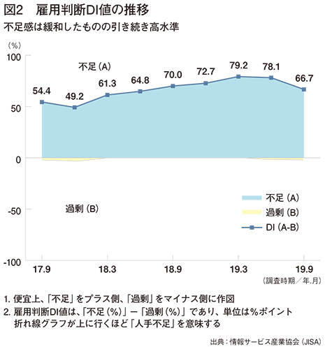 経済産業省「特定サービス産業動態統計」の情報サービス産業の売上高を情報サービス産業協会(JISA)がまとめたところによると、2018年10月以降、一貫して前年同期比でプラスで推移。情報サービス市場における受注環境は良好で、SEの稼働率も高水準を保っていることがうかがえる。JISAの向こう3カ月の雇用判断DI値では、人手の不足感はピークを越えたとはいえ、不足感が高い水準を保っている。