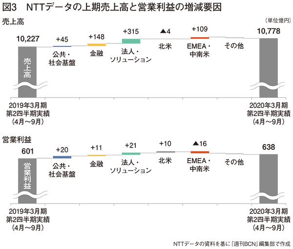 NTTデータの上半期(4-9月期)業績は、売上高、営業利益がともに増収増益と好調に推移した。懸案だった北米市場での受注高も前年同期に比べて856億円増えており、順調に進んでいることを印象づけた。