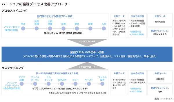 一方で、RPAが担う自動化は、個人のタスクレベルに限られる。「言ってみれば、同一のPC内で完結するタスクを自動化するのがRPA。RPA導入にあたっての現状把握には、プロセスマイニングよりもミクロな視点でのアプローチである“タスクマイニング”(PC内のセンサーで捕捉した操作ログの収集・分析)が有効」だと松尾シニアマネージャーは話す(図参照)。そこで同社は、タスクマイニングのための分析ツールとして業務可視化ツール「CICERO」もラインアップしている。