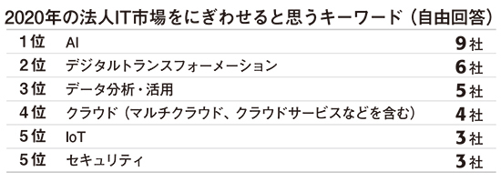 では、今年の市場をにぎわせるであろうキーワードは何か。各社に自由回答で聞いたところ、1位は「AI」だった。週刊BCNの毎年の調査でも、第3次AIブーム中の17年から継続して「AI」がトップを飾っている。ただ、ブーム当初は経営者から「AIで何かやれ」と言われてPoCだけで終わるというケースも少なくなかったが、今年に関しては「AIの実装が進む」と、本格的な導入・活用が進展とみる企業が多いようだ。
