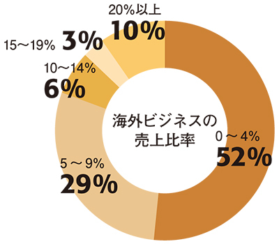 まず、海外ビジネスの売上比率について聞いたところ、「0~4%」が52%と半数を占めた。次いで多いのが「5~9%」の29%で、以降「10~14%」が6%、「15~19%」が3%、「20%以上」が10%と続いた。