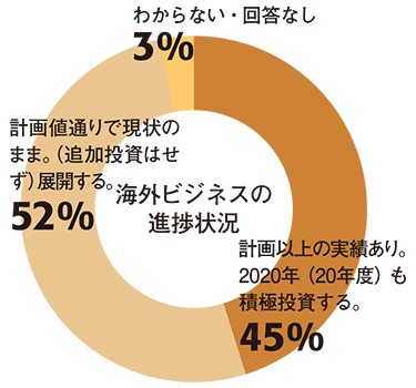 海外ビジネスの進捗状況については、「計画以上の実績あり。2020年(20年度)も積極投資する」が45%、「計画値通りで現状のまま。(追加投資はせず)展開する」が52%となった。なお、「実績はないが積極投資する」という選択肢もあったがそう答えた企業はなかった。