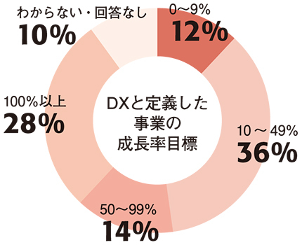 その上で、「自社でDXと定義したビジネス領域の売上比率」を調査したところ、一番多かったのが「20%以上」の50%。また、「DXと定義した事業の成長率目標」については、「10~49%」が36%と最も多く、次に28%が答えた「100%以上」が続いた。特徴的なのは、ここで「100%以上」と答えた企業は、売上比率の問いで「20%以上」と答えた企業に多いこと。すでにDXである程度の収益を上げながら今後も大きな成長を狙っていくというDXビジネスへの注力姿勢がうかがえる。