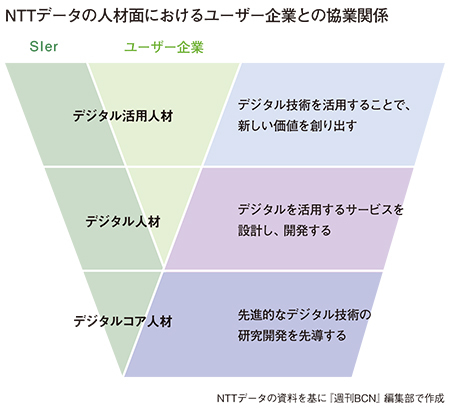 NTTデータでは、SIerとユーザー企業に必要なデジタル人材を「デジタル人材」と「デジタル活用人材」に分類している。前者はデジタルを活用するサービスを設計、開発する人材で、主にSIerが中心となって担う部分。後者はデジタル技術を活用して新しい価値を創り出す人材で、ユーザー企業が主体となって育成するものと定義。SIerとユーザー企業で重なり合う部分も多分にあり、DX推進の人材を両者協業しながら育成していくイメージを描いている(図参照)。
