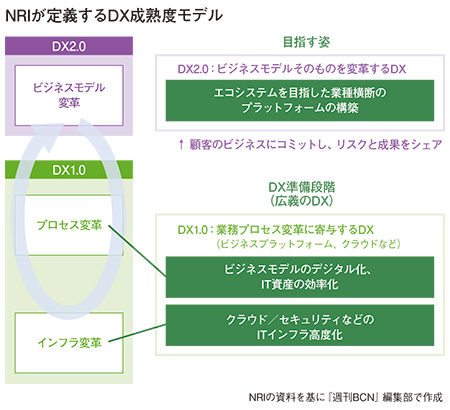 NRIでは、ユーザー企業のDX成熟度モデルを「DX1.0」と「DX2.0」に分けて捉えている(図参照)。「DX1.0」はデジタル技術によってビジネスモデルを転換する、いわば準備段階に当たる。「DX2.0」につなげるためのITインフラの刷新を主眼としており、コンサルティングもITや業務プロセスの変革を中心としたもの。SIerにとっての収益モデルは既存のSIと大きな変化はない。しかし、成熟度が高まって「DX2.0」の領域に入ると、「既存のSIビジネスとは大きく異なる収益モデルの割合が増える」と、此本会長兼社長は予測する。