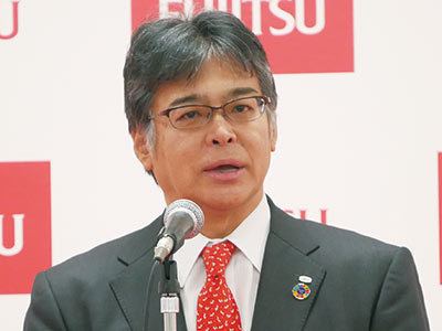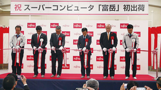 初出荷を迎えテープカットする富士通の時田社長(左から2番目)、