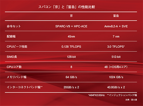 搭載しているCPUは、「A64FX」と呼ばれる新たなチップで、アームのv8-A命令セットアーキテクチャーをスパコン向けに拡張した「SVE」を使用。最先端の半導体技術により、全ての機能をワンチップに集約しており、CPUのピーク性能は京の24倍となる3TFLOPS、メモリバンド幅は京の16倍となる1024GB/sを実現。また、消費電力は、最新のインテルCPUと比較して3.7倍以上の効率性を発揮するという。