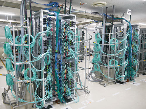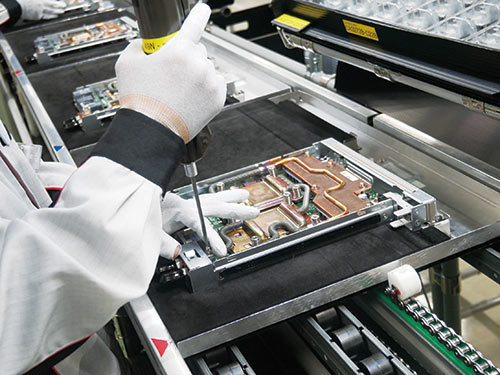 完成した基板は、1階の組立工程に運ばれ、ケースに基板を組み込み、同時に水冷装置を固定。専用の治具を使って確実に固定する。装置が組み込まれたケースは、ラックのエリアに搬送。ラックに組み込まれた後に、最終検査を経て出荷準備が行われるという仕組みだ。