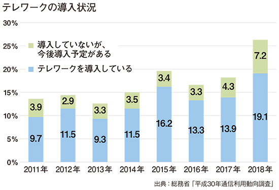 働き方改革に有効な手段の一つとされる「テレワーク」は、国も普及を促している。その一環で17年から毎年開催されている「テレワーク・デイズ」(17年は「テレワーク・デイ」として実施)は年々規模が拡大。19年は7月22日から9月6日にかけて開催し、計2887団体約68万人が参加し、交通混雑の緩和や業務効率化・コスト削減に効果が出た。