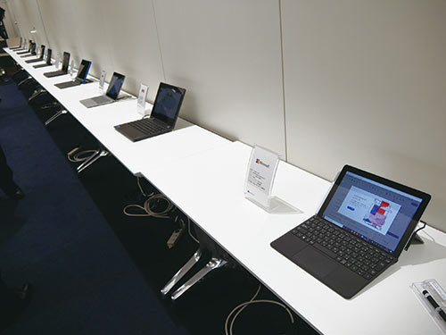 GIGAスクール対応PCは、「特別な低価格ライセンスを活用した製品」(日本マイクロソフト)であり、1台あたり4万5000円の補助を想定した価格設定が可能になるという。GIGAスクール構想の閣議決定後に、米本社、アジア、日本をまたぐバーチャルチームを作り、この構想に最適化したライセンスやプログラム開発を行ってきた成果だとしている。Dynabook、デル、日本エイサー、日本HP、NEC、富士通、マウスコンピューター、レノボ・ジャパンの8社から、標準仕様に準拠した17機種が用意されている。今後、ラインアップはさらに増加していくという。