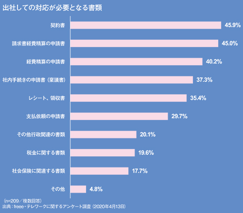 ところが、本来実施できるはずである多くの企業でもテレワークが行われない、または社員が出社を余儀なくされているという状況が各種調査によって明らかになった。浮かび上がってきたのは、経理や管理、営業部門の担当者の間で、契約や請求という取引先との書類のやり取りに起因する「意思に反する出社」が多いという問題だ。