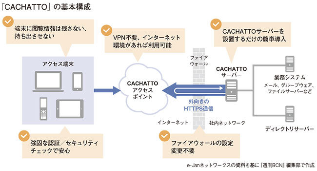 CACHATTOの基本的な構成では、CACHATTOサーバーをファイアウォール内に設置し、リモートからアクセスすることで必要な情報だけを表示する。社内のCACHATTOサーバーから社外のアクセスポイントへは、外向きのHTTPS通信のみを利用する。そのため導入は容易で、外部からの侵入リスクも小さくできる。CACHATTOサーバーにはCACHATTO専用のブラウザーである「CACHATTO SecureBrowser」からアクセスすることで、情報は端末に残さずにリモートから閲覧でき、端末の盗難や紛失による情報漏えいのリスクも抑えることができるのだ。